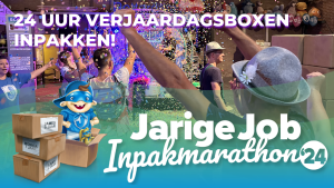 Stichting Jarige Job gaat live tijdens de 24 uur durende Inpakmarathon! Honderden vrijwilligers hebben zich aangemeld om verjaardagsboxen in te pakken voor minderbedeelde kinderen. Het doel is meer dan 10.000 ingepakte verjaardagsboxen om voorraad op te bouwen voor de zomerperiode. Vierentwintig uur achter elkaar inpakken is een hele prestatie en daar maken we dan ook een echt feestje van!